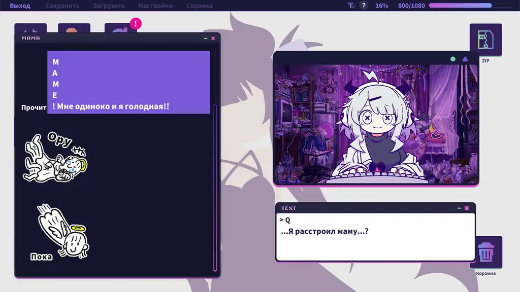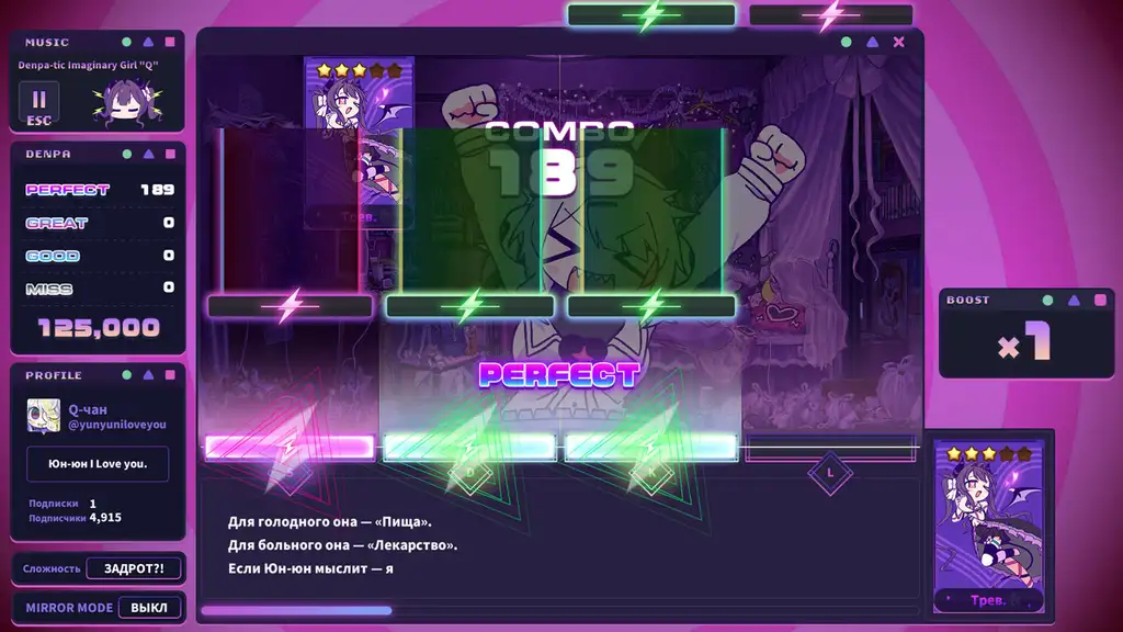 Yunyun Syndrome!? Rhythm Psychosis — это ритмическое приключение, которое маскирует глубокий психоделический опыт под привычный интерфейс операционной системы. Игрок нажимает клавиши в строго заданном ритме под треки жанра дэнпа. Каждое точное попадание порождает огромные текстовые посты, которые мгновенно разлетаются по социальным сетям. Рабочий стол постоянно завален цифровым мусором, уведомлениями и открытыми окнами. Точность действий игрока напрямую определяет скорость распространения специфической пропаганды среди пользователей сети. Идеальные комбо превращаются в цепные маниакальные сообщения, которые заражают глобальную паутину деструктивными идеями и меняют поведение виртуальных обитателей.