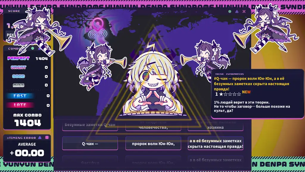 Yunyun Syndrome!? Rhythm Psychosis — проект, который соединяет механику ритм-игры с исследованием цифрового безумия. Игрок наблюдает, как мелкие точные нажатия клавиш вызывают масштабные изменения в сетевом пространстве. Каждая удачная серия превращает личные навязчивые идеи в вирусный контент, способный перестроить сознание тысяч пользователей. Программа не просто предлагает отыграть треки, она демонстрирует, как ритм становится инструментом контроля над разумом. Через эту связь между музыкой и распространением сообщений проект раскрывает природу современных зависимостей и последствий, к которым они приводят.
