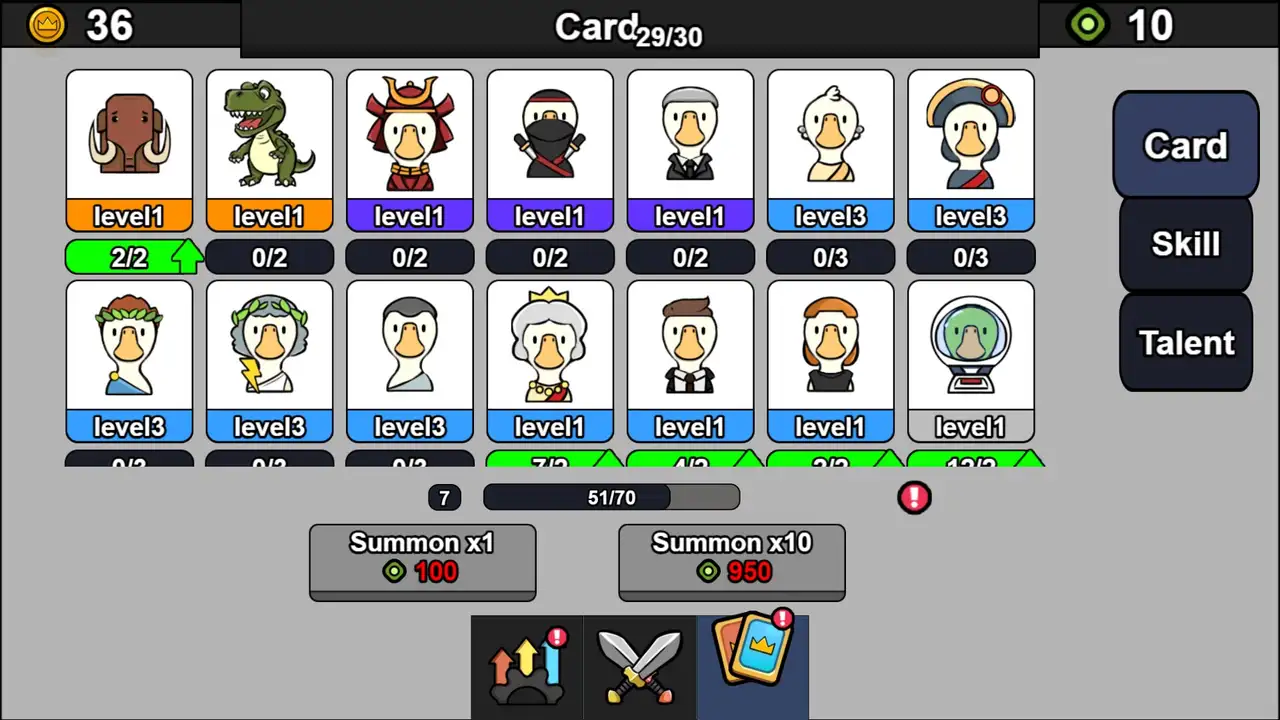 Длительное усиление армии реализуется через коллекционные карты и дерево талантов. Победные действия предоставляют алмазы, необходимые для раскрытия новых способностей, основанных на исторических и фантастических архетипах персонажей, среди которых встречаются командующие, исследователи и существа древности. Использование зелий талантов способствует совершенствованию характеристик гусиной стаи, улучшая механизм прохождения через различные эпохи.