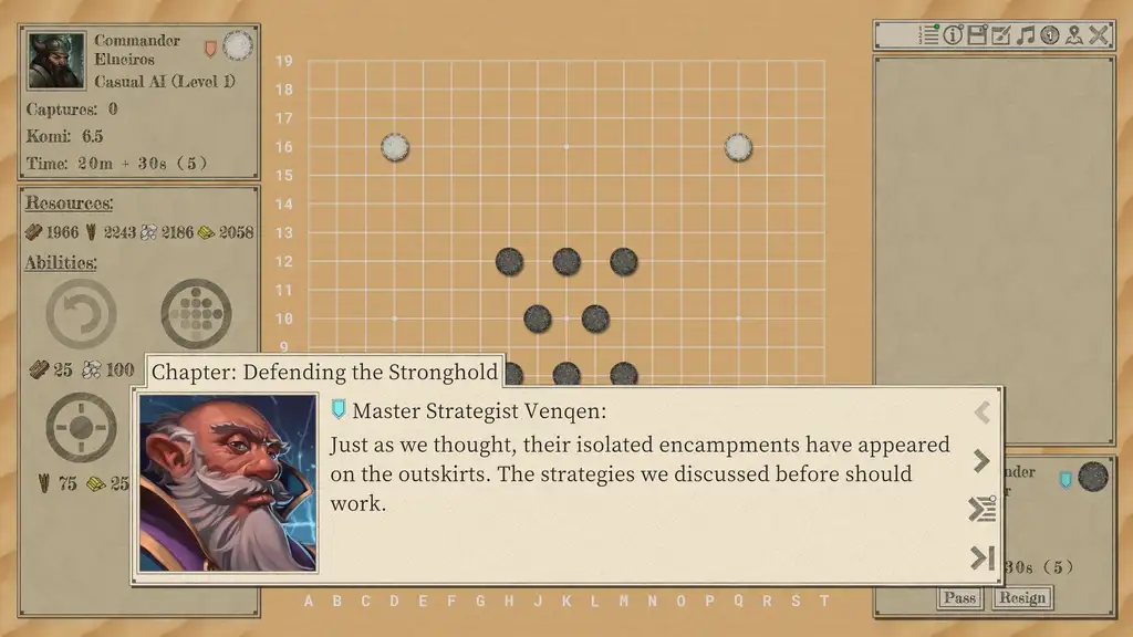 В режиме кампании пользователь будет сталкиваться с системами контроля ресурсов и территориального соперничества между разными нациями. Столкновения с противниками реализуются в формате отдельных партий Го с возможностью защиты и расширения контролируемых областей. Игроки постепенно развивают свои навыки, участвуя как в традиционных матчах, так и в задачах на определение оптимальных ходов. Система обучения подкрепляется интеграцией искусственного интеллекта различного уровня, позволяющего настраивать сложность, анализировать партии, определять сильные и слабые ходы.
