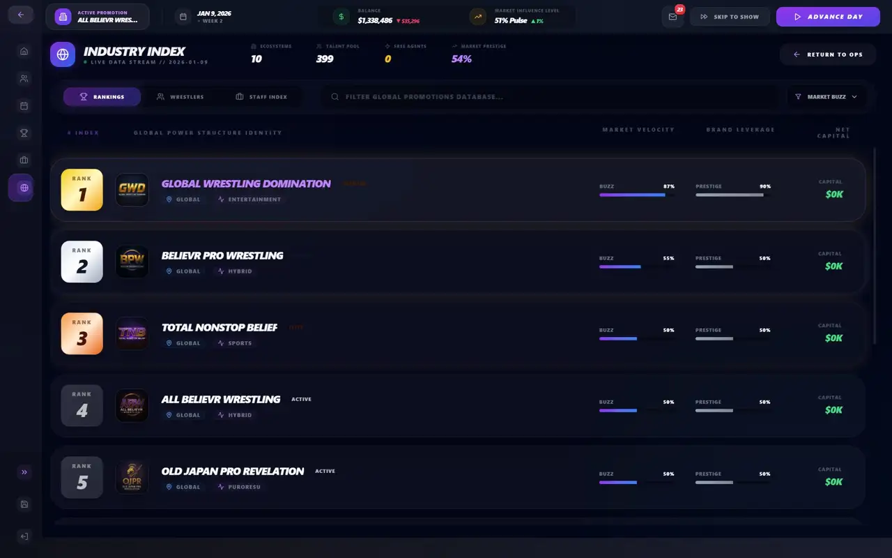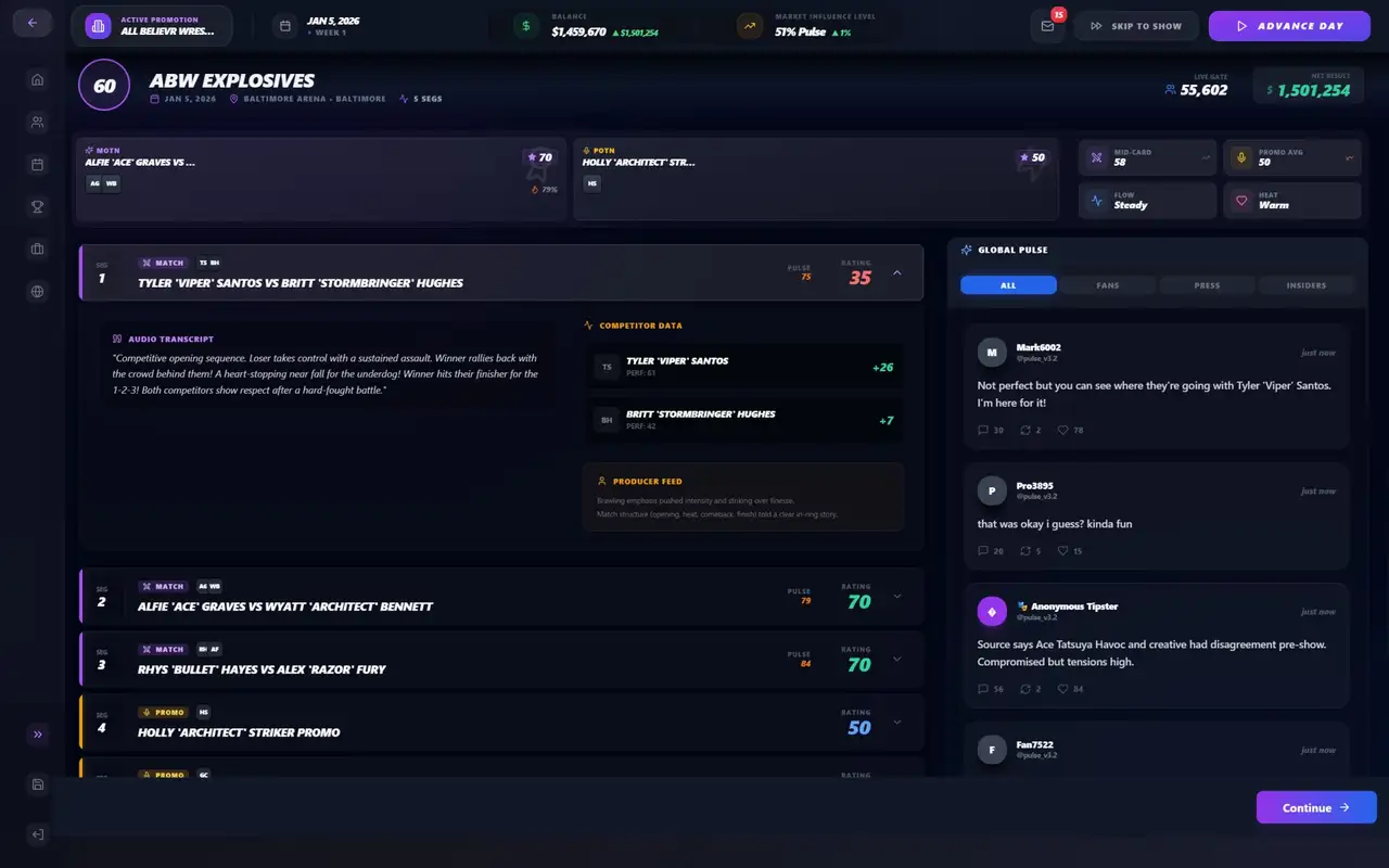 В то время как геймер развивает собственный промоушен, конкурирующие организации, управляемые искусственным интеллектом, также внедряют новые стратегии и подстраиваются под изменения рынка, что создает условия для постоянной конкуренции. Механика шоураннера позволяет каждое мероприятие провести с подробным повествованием и живыми комментариями, предоставляя возможность наблюдать реальное влияние выбранного букинга, а не просто статистические изменения.