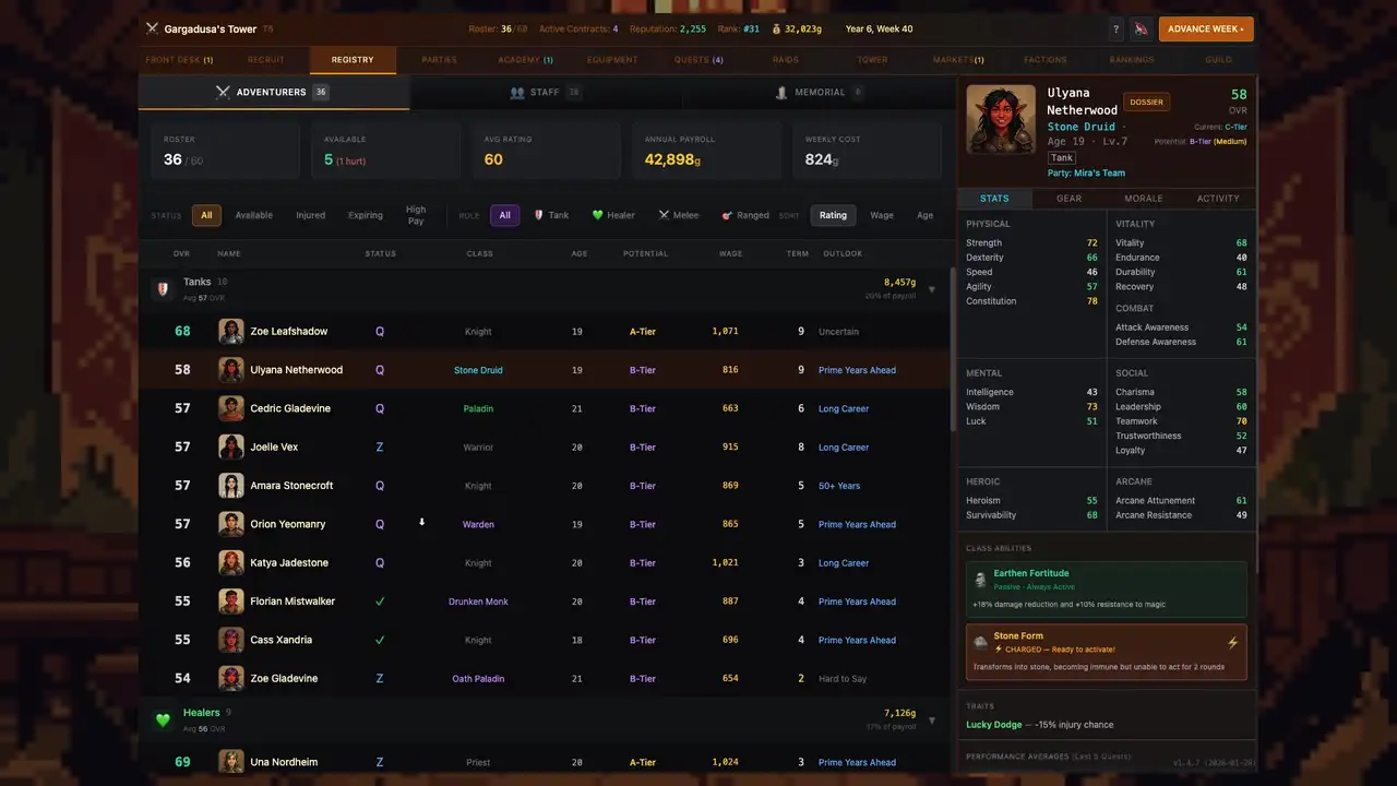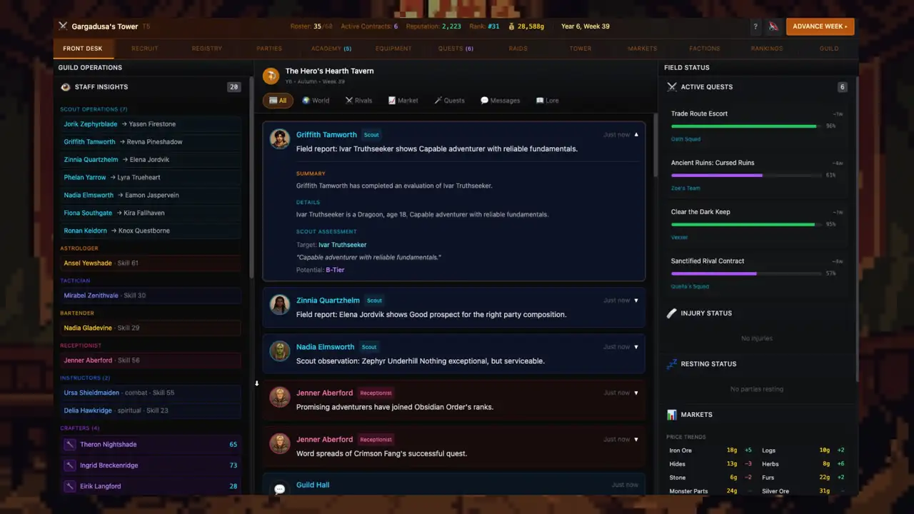 Вне исследовательских походов игрок разрабатывает новые методики обучения, повышает устойчивость материальной базы, наблюдает за изменениями в иерархии коллектива. В игру встроены механизмы влияния, завязанные на динамику взаимоотношений внутри гильдии, включая репутацию и индивидуальные мотивации.