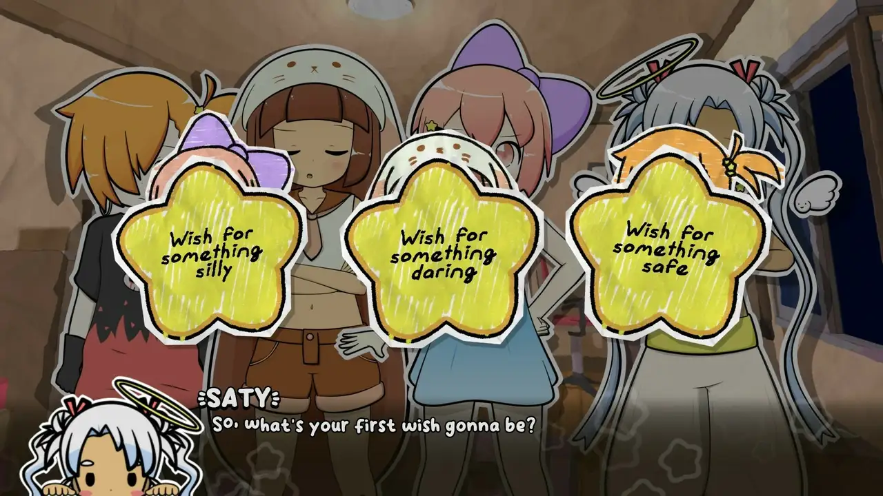 Three Wishes — визуальная новелла, построенная на пародии и анализе классических элементов жанра. Игрок управляет повествованием, взаимодействуя с персонажами посредством нестандартных действий, в частности с помощью похлопываний по голове, что становится центральным элементом механики и влияет на развитие сюжета. В процессе прохождения младшие сёстры айдолов оказываются вовлечёнными в серию событий, наполненных абсурдом и неожиданными поворотами, что подчеркивает характер проекта. В этом повествовании каждая реплика и мысль героев формирует ощущение непрерывного диалога, поскольку экспериментальная система позволяет персонажам реагировать даже на незначительные поступки игрока. Механика связи между действиями и исходами становится инструментом для высмеивания устоявшихся клише визуальных новелл. Проект нарушает привычную границу между произведением и его участником, прямо обращаясь к игроку и демонстрируя осознанность происходящего.
