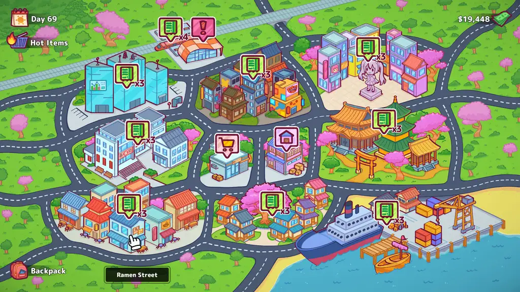 Предприниматель управляет личным грузовым фургоном, который служит основным инструментом логистики. Водитель своевременно пополняет запасы товаров и украшает кузов яркими виниловыми наклейками. Стратегическое размещение автоматов на знаковых точках города, будь то шумная Улица Якудза или спокойная Храмовая площадь, напрямую влияет на объем ежедневной выручки. Владелец бизнеса самостоятельно устанавливает цены или пользуется встроенными аналитическими подсказками, чтобы найти оптимальный баланс между спросом и прибылью.