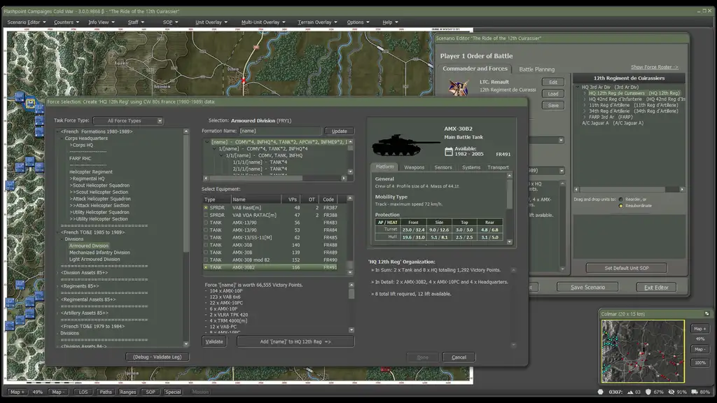 Проект включает значительный набор сценариев и кампаний, оборудование вооружённых сил нескольких стран, и реализует широкий набор возможностей по настройке и модификации игровых данных. Для анализа боевой обстановки предусмотрены интерактивные окна информации, карты с различными наложениями, а также визуализация зон поражения. Каждая нация представлена уникальными характеристиками, командными параметрами и соответствующим вооружением, что детально отражено в игровых таблицах.