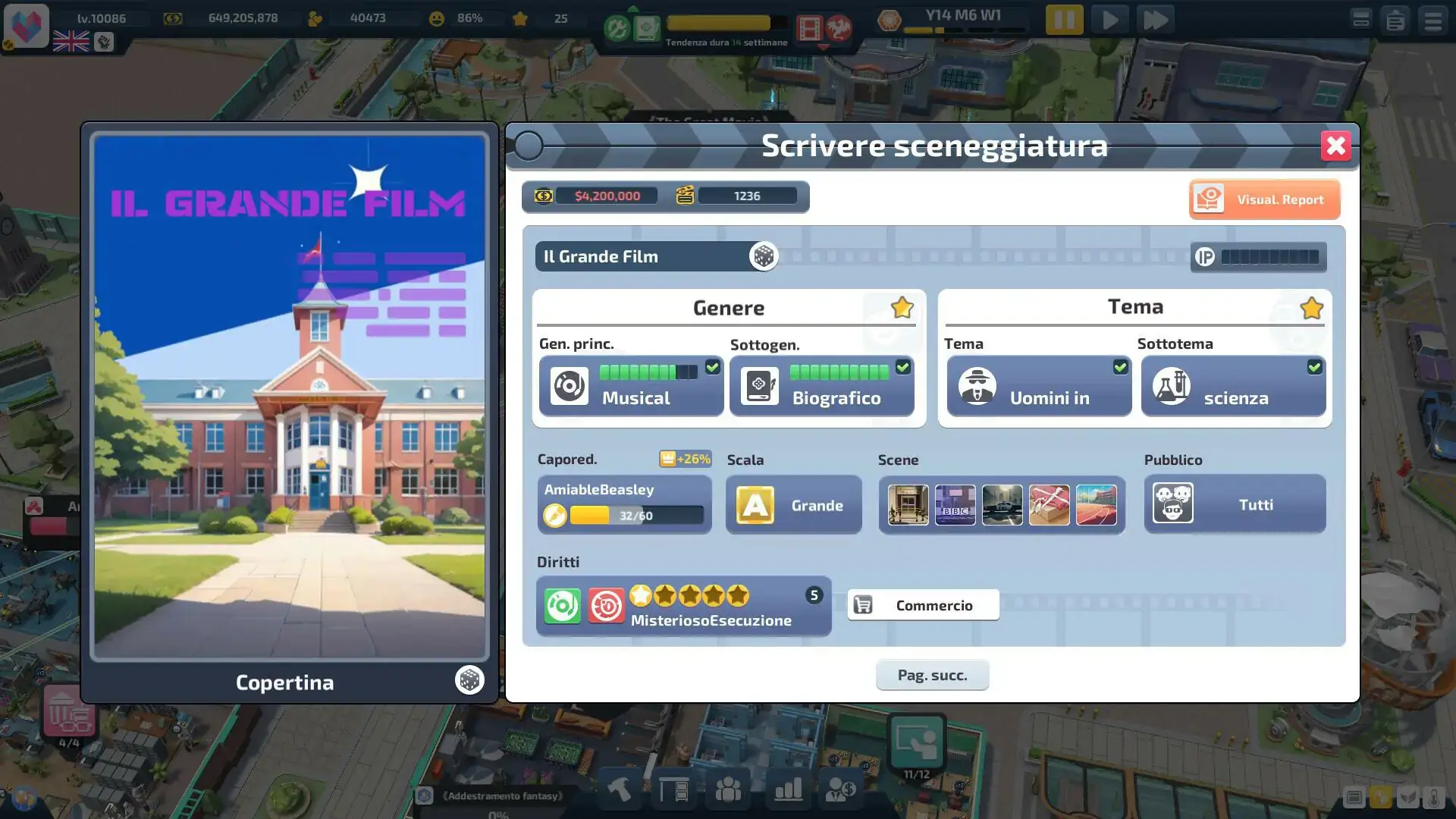 Игра предлагает пройти полный цикл создания картины. Разработайте оригинальную историю, населите её запоминающимися персонажами, постройте масштабные павильоны для съёмок и добавьте спецэффекты для усиления зрелищности. Super Movie Tycoon даёт шанс реализовать творческие амбиции и построить голливудскую империю с нуля, управляя каждым аспектом кинопроизводства.
